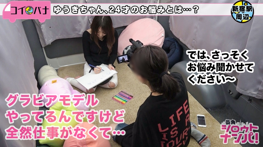 ◆この企画は【女流監督ゆる子】が街行く女性たちのお悩みをゆるっと聞き出し、そしてエロを以って解決しちゃおうという企画です◆愛車“LOVEワゴン”の車内で異性には明かせない悩み、そして隠された性欲までもを引き出し、身も心もハダカにしていきます!【ゆる子の要点メモ】①新宿でGETしたのは黒ニットから巨乳が飛び出すナイスバディなゆうきちゃん②現在彼氏はなし。元カレと別れて2~3年が経過しているとの事。彼氏が欲しいながらも作らない理由としては「自分が自由人で、彼氏に時間を取られるのが嫌」らしく、あまり恋愛体質ではないみたいです③で、肝心の性事情はと言うと程良く遊んでいるようですw出会いのきっかけは「逆ナン」らしく、飲み屋で会ってホテルに直行するというなんともアグレッシブな方ですw④性癖を尋ねると「すっごいドMなんですw」というゆうきちゃん。そのドMならではのびっくりエピソードが飛び出します!ゆうきちゃんが語る“堪んないシチュエーション”とは?⑤出会ってからずっと気になっていたお胸のサイズはなんと驚異のGカップ!!その胸を夜のハンティングに活かしていると語るゆうきちゃん。敢えて巨乳を強調する服を着る事で男が「ワンチャンあるかも」と思ってくれるのが狙い目なんだそうですwww理由は「折角夜の街に繰り出したらヤりたいじゃないですかw」とホントに超肉食www⑥ここでグラビア関係の仕事をしているテイで性の助っ人(男優)が登場。少々怪しさを感じながらもグラビアの仕事を紹介して欲しいゆうきちゃんは助っ人さんに乗せられるがままに純白の下着姿に⑦そして、そのままグラビアのポージング撮影を決行。“お手伝い”という名目で助っ人さんが背後からおっぱいを揉みしだくとエッチな吐息が漏れ始め、乳首がビンビンに♪⑧あまりに素晴らしい巨乳なので照からせちゃおうという事でグラビアの定番(?)であるオイルをぶっかける助っ人さん。塗る前も敏感だったのが更に感じるようになったようでビクつきが止まりませんw⑨今度はお尻にもオイルを塗りこみ、四つん這いに。完全に無防備なま●こに電マで刺激を与えてあげるとものの数分でイッちゃいましたw⑩手マンでも更なる快感を得たゆうきちゃんに抵抗する意識なし!寧ろ性の虜、男の性奴隷かの如く従順にフェラでご奉仕。時にヨダレを垂らしつつバキュームフェラで男に尽くす!しゃぶり尽くす!!その姿が激エロっす⑪そして、いよいよ挿入―。パイパンま●こだからチ●コが入ってるのが良く見えて興奮度倍増ですね~♪爆乳を揺らしながらイキまくるゆうきちゃんに勃起不可避な事間違いなし!!最後は自慢のお胸を白く汚してフィニッシュ。かと思いきや、最後にひと吹きさせる助っ人さんのプロ魂w2週間振りに男の人にご奉仕出来て満足な様子で帰って行ったゆうきちゃんでした♪では、また次回!!(by ゆる子)★★★