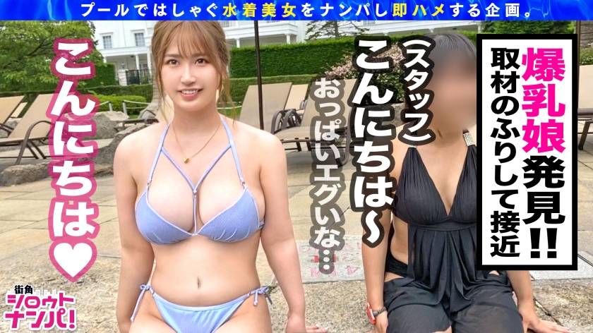この企画はプールで見つけたビキニギャルをナンパして、心もカラダも開放的なセックスを愉しんじゃおうという企画。某プールで見つけた今回のターゲットは男性たちの視線を独占する色白爆乳ギャル【ワカちゃん 21歳 美容系専門学生】水着から溢れるふわふわオッパイに迫力満点の巨尻!!抱き心地の良さそうな肉厚ボディはガン見不可避!癒し系の笑顔がめちゃめちゃ可愛い彼女だが、実は普段から遊び歩いているパリピらしい!今日も夏の思い出作りということでプールに男を漁りに来たんだとかwwノリ良し、性格良し、エッチに対しても寛容な彼女を楽勝でホテルに連れ込み成功♪「男を選ぶ基準はおち○ちんの大きさ」だというドスケベギャルが遂に今までの人生で1番のチンポに出会う?!超ド級の巨チンに大興奮♪濃厚夏パコセックスいざスタート!!重量感ある爆乳に破壊力のある巨尻!!爆乳かつパイパンという組み合わせも最高!!ムッチムチのわがままボディを揉みしだき、一生揉んでられそうな最高のモミ心地を堪能!男の反応を楽しむかのように見つめながらねっとりフェラチオ!言われなくても喉の奥まで入れてデカチンを味わう様に咥えるサマは激エロすぎる!!弾力ケタ違いの乳圧で擦り上げるパイズリで、もう我慢の限界!ギンギンに反り返ったチ○ポをズブっと挿入!!デカ尻をバックでパンパン突いて、ぶるんぶるん揺れる爆乳&尻肉を眺めてエンジョイ!!感度抜群なムッチリま○こが遂に決壊?!今まで経験したことのないデカチンでガツガツと突き刺す度に押し寄せる快感と止まらないハメ潮!!快楽のプールに溺れまくって一生に一度の夏の思い出作っちゃいました♪