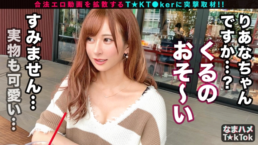 T☆kTokでエッチな動画を投稿するエロ可愛い女にDM(ダイレクトメッセージ)で連絡を取り、その場のノリでしれ~っとSEXまでしちゃおうという、次世代ナンパ企画!(1) 事前にスタッフが連絡を取り渋谷区の神宮前で待ち合わせた、今回のT☆kT●kerは「リアナ」ちゃん(22歳)!現役女子大生の彼女はT☆kTokでエロい動画を投稿してイイネとフォロワーを稼ぐことにハマっているようだ。顔面偏差値高めでスタイルも抜群の彼女は今まで男からDMが来たようで40人くらいのフォロワーと直接会ったらしい。その中でSEXまでした人はいるのと聞くと「ほぼ全員」と驚きの答えが!まさに会えばヤレるT☆kT●kerだ!では我々もとノリで聞いてみると「余裕でOK」と嬉しい返答がさすが今時のヤリマン軽すぎる!(2)早速ホテルの一室へ到着したのも束の間、速攻で電マオナニーを見せつけてくれるリアナちゃん!いやらしすぎる光景を目にして我慢ができず彼女の吸い付くような美ボディーを味わうなまハメSEX!(3) 一回戦を終え今度はT☆kTokで着ていたエッチな衣装で濃密プレイ!彼女の柔らかくて形のいい神尻が際立つ食い込みパンツでジュボジュボフェラ!電マとバイブで責め立てた後生チ○ポで感じまくりハメ潮が大噴射そのまま中出し!エロすぎるこのカラダ!(4)これで終わりかと思ったらまだまだヤリたりないとまさかの3回戦突入!濃密に絡み合いながら二人の性欲は最大限まで高まり爆発!休む間もなく何度も繰り返されるハードSEXに気持ち良すぎてそのまま中出し!チ○ポを抜き白い精子がマ○コから垂れ降りる!十分すぎる撮れ高の濃密SEXを見せつけてくれたリアナちゃんでした♪