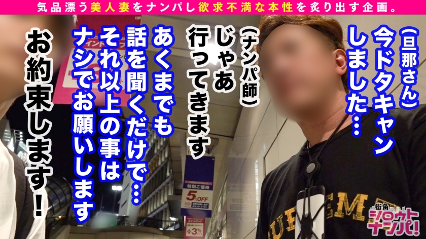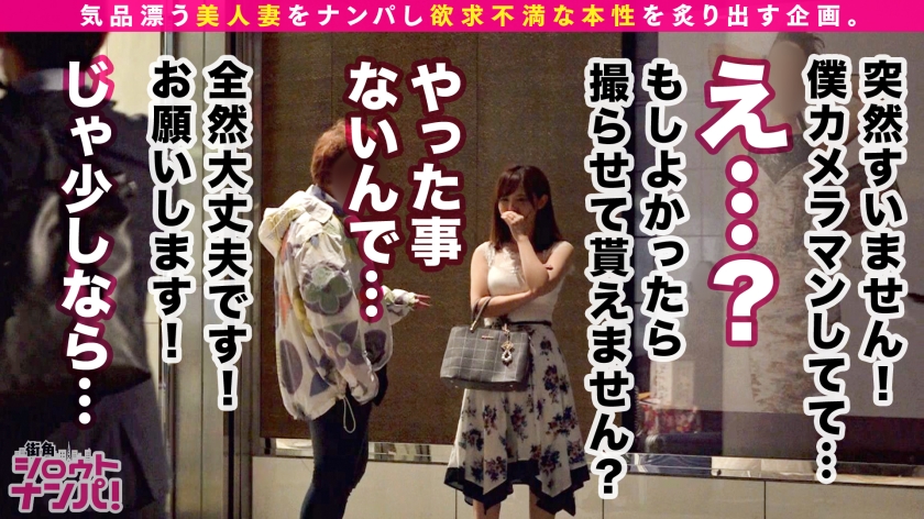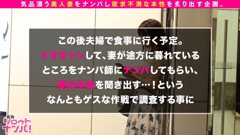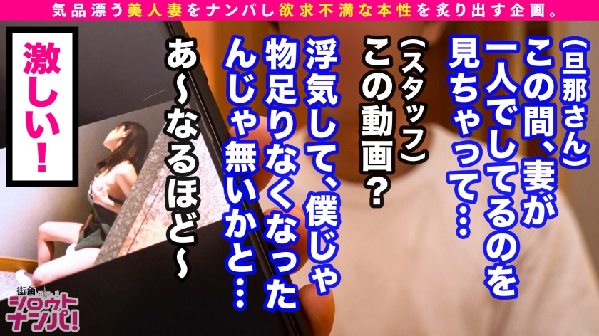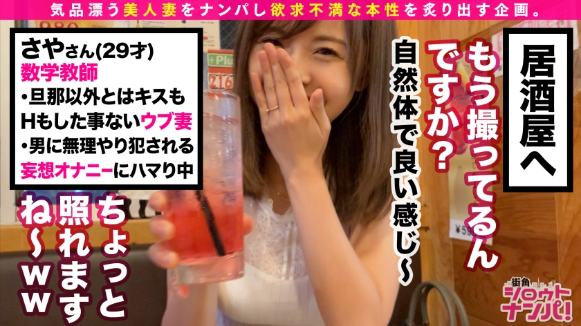 この企画は気品漂う美人妻たちを街角でナンパ!旦那の不満を聞き出して欲求不満な人妻の性の本性を炙り出す企画である。今回のターゲットは【サヤさん/29歳/数学教師】サヤさんの旦那様から浮気調査を依頼されたため、彼女をナンパ→口説き落としセックスまでしてしまおう(旦那には内緒w)という作戦!!いよいよ作戦決行当日…童顔で小動物フェイスの可愛らしい奥様を発見!嫌と言えないお人好しな性格に付け込んで、まずは軽々とナンパ成功ww居酒屋に移動し話しを伺うことに!実は旦那以外の男性とはキスもセックスもしたことがないという生粋の清純派奥様!それなのに最近旦那が浮気を疑って来ることに嫌気がさしている。夫として旦那に不満はないが、最近は性生活でも満足する前に旦那が果ててしまう。自分から浮気する勇気はないが、最近は他の男性に無理やり犯される妄想をしながらオナニーをして欲求を満たしているんだとか。まさかそんな願望を抑えているドスケベ女だったとは!!そういう事ならお望み通りに…と、強引に部屋に連れ込んで無理やり迫ってセックススタート!!嫌だ嫌だと言いながらも身体は正直で、ブラをずらせば大きめな乳首がもう勃っているとか、期待しすぎでしょ!下着の中に触れるとクチュクチュと音が立つほど溢れ出る濃厚な蜜…指を動かしてみると潮まで吹いちゃったりして…!!仕舞には嫌がっていた事も忘れ、自ら夢中でチ○ポを喉奥まで咥え込む!!そんなドМ奥様にお仕置きピストン!!ガンガンに突きまくると虚ろな目で気持ち良さそうに絶頂!!旦那のチ○ポより気持ち良いのは一目瞭然!!清純妻が卑猥な腰つきで乱れ狂う!旦那がいるとは思えないイキっぷりで中出し2連発!!