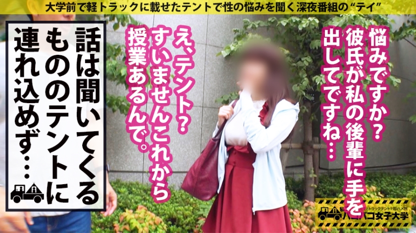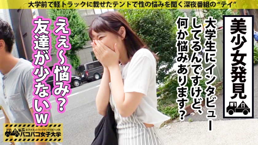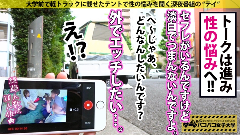 移動式テントで各大学を回り「性の悩みを聞く深夜番組」のテイでイマドキ女子大生に近づきセックスを撮影する企画です!目標は都内137大学の完全制覇!!!■報告レポート①今回お邪魔したのは『K大学』!可愛い子が多いという噂をよく耳にするが果たして…!②『悩みありませんか~?』と聞くと日本の年金問題が心配な話をしだすちょい天然な彼女。もっと身近なことを聞いてみたら、現役で入学したわけじゃないので1年生だけど現在20歳なんだそうな。ちょっぴりだけ周囲の人間関係に悩んでいるらしい。そのままインタビューOKを頂いたのでテントの中へ!③彼女の名前は「あやめ」ちゃん!家政学部というイマイチよくわからん学部…。説明してもらったけど、彼女自身も上手く説明ができず結局ナゾなまま…。0歳の頃から赤ちゃんモデルとして働き、ついこの間まで芸能活動をしていたらしい!学校にあんまり行けない時期もあったのであまり賢くはないようである…。④芸能関係の仕事をしていたこともあり、出会いは結構多かったみたい。というかチョロそうなのを見抜かれてるだけで、付き合った人数は5人だけど経験人数は25人というお股ユルい系女子でした。その流れで性の悩みを聞くと、セフレがいるけどセックスがマンネリ化してしまっているという!もっと外でHしたりと趣向の変えたことをしてみたいのだという!恥ずかしがりつつも質問するとどんどん答えてくれるあやめちゃん!路上の傍らのテントの中という半青姦状態でのボディタッチにドキドキのムラムラになっちゃってます!⑤自分から『舐めてほしいです…』と、おっぱいを差し出すくらいすぐにノリノリになってしまったあやめちゃん。こんな感じで男たちに体を許してしまってきたのでしょう…。今もなおセフレ3人と日替わりSEXしてるのにも納得。ヌレヌレになったオマ○コをチ○ポで突きあげると思わず声が!必死に抑えようとする表情に萌えますな!揺れる真っ白な胸と尻肉を存分に堪能しお別れ!⑥大きなチ○ポに巡り会えて相当嬉しかったご様子!これを機に、勇気を出してセフレに『外でやろうぜ!』って言えればいいね!