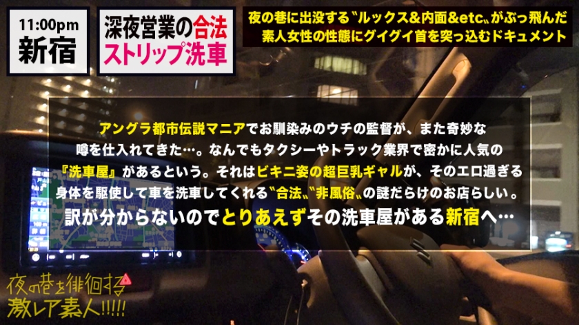 ○テーマ:夜の巷に出没するルックス&内面&etcがぶっ飛んだ素人女性の性態にグイグイ首を突っ込むドキュメンタリー○今回のシロウトさん:セクシー洗車嬢のアンちゃん、ユリナちゃん。①変わった人がいると噂を聞きつけて都内某所にある洗車屋にやってきました。遠目から観察していると、巨乳の美女が水着姿でタクシーを洗車しております。早速取材を申し込むべく、突撃!②洗車屋で働くアンちゃんとユリナちゃん。今日のノルマ分の支払いで取材を承諾して頂けました!早速洗車をお願いすると、今にもこぼれそうなおっぱいを惜しげも無く窓に押し付けながら車を洗ってくださいます!セクシー洗車は徐々にエスカレートしてゆき、サイドミラーを谷間に挟み込んでパイズリのような卑猥な動きをして見せつけてくる洗車嬢達。しまいにはおっぱいで車を洗いながら乳輪ポロリまでしちゃうサービス精神っぷりです③もう少し彼女達のことを探りたかったので、ご飯に誘ってみると喜んでついてきてくれました!お酒を飲みながら仲を深め、いい感じに酔っ払ったところでホテルに連れ込みます。何でホテル?と訝しみながらも夜景と広い部屋にテンションUPなお二人。再びワインで乾杯して飲んでいるうちにアンちゃんがまさかの寝落ち!その隙にユリナちゃんを別室へと連れて行きます。④別室に連れ込まれたユリナちゃん、お酒の力でなのか、いかにもエッチな気分になってます状態だったので大きなおっぱいを弄ってあげると、セクシーな声を出して感じているご様子。男優の巨根にテンションが上がったのが、卑猥にフェラやパイズリでご奉仕してくれちゃいます…。⑤一方、寝落ちしたアンちゃんに夜這いをかけるもう一人の男優。大きなおっぱいを揉んだり吸ったりされて気持ちよくなってきたアンちゃん。Hカップのおっぱいはち○こを挟むと、すっぽりと隠してしまうほどのボリュームです!!感度の良いおま○こに挿入してピストンすると、アヘアヘ状態になりながら卑猥な声でよがりまくるアンちゃん。膣奥を激しく突き上げて、最後は可愛いお顔に発射して終了!あまりの激しいセックスに放心状態になってしまうアンちゃんでした。