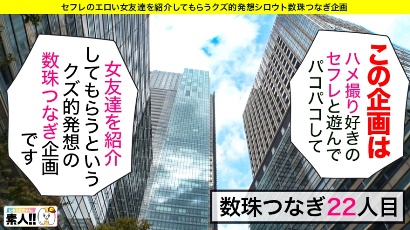 素人娘と遊んでパコってHな友達も紹介してもらう企画。今回のお友達は他人に褒められる所は胸で女の子が苦手なまりちゃんは今まで彼氏は一人。元カレと別れた原因は元カレの浮気なんだって。そんなまりちゃんは絶対浮気を許さないんだって。夢はお嫁さんになることで30歳までに結婚したいんだって。どこでも感じる敏感なまりちゃんの大きな胸をさわると「はぁはぁ~」と息を荒げ、気持ちい所は1位・アソコ近辺、2位・オッパイ、3位・背中なんだってさぁ~~。そんなまりちゃんと濃厚なDキスから電マを感じる所にあてると「うぅ~、うぅ~」と声をあげ、さらに、クンニすると「ヤバい、イクッ、あッ、はぁ~」とあえぎ手マンでマ○コを突くとグチョグチョに濡れまくったまりちゃんがチ○ポをジュルジュル口奥までおいしそうにしゃぶってくれました。そして勃起したチ○ポを膣奥に入れると「イクイク、イッチャウ、気持ちぃ~、奥好き~」と絶頂寸前!気持ちよすぎて自ら腰を動かし「イッチャウ、イッチャウ」といやらしい顔で見つめてくるまりちゃんは騎乗位で上下に動き「気持ちぃ、もっとして~、イクッイクッ、やめないで~」と言うまりちゃんの美乳に発射しました。まりちゃんは「気持ちよかった」と言ってくれました。くだらないことで笑えたらそれでいい、自分の悦びよりも相手の喜びを大事にしは気持ちぃぃと「ヤバい、ヤバい」を連発するまりちゃんはかわいいお友達を紹介してくれました。