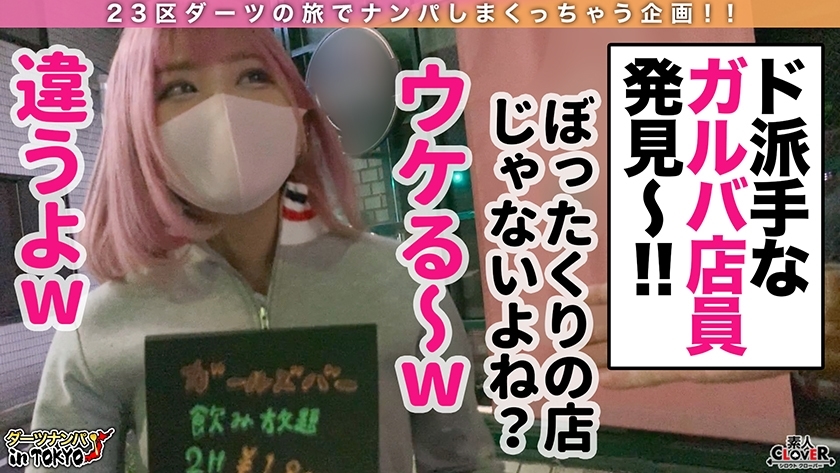 痙攣が止まらないピンク髪ドM娘【るるちゃ。/22歳/ガールズバーキャスト】東京の23区の地図にダーツを投げ、刺さった街で女性をナンパする企画ダーツナンパinTokyo!今回ナンパしに行くのは酒飲みの街、北区赤羽!道を歩ていると看板を持った一際目立つピンク髪の女性を発見♪話かけて応えてくれたのはガールズバーで働く『るるちゃ。』さん(以降るるちゃ)。赤羽の良いところを聞くべくるるちゃのお店へ行くことに…お店に入るとウサギ(?)コスプレのるるちゃが登場!既にお酒が入っているからか出来上がっていてテンションがおかしい。乾杯して改めてお話を聞くと「赤羽は安く沢山お酒が飲める」とその言葉通りにガンガン飲むるるちゃ。これはいけると思いアフターへ誘うと快諾♪お店を出てホテルの部屋で飲むことに!部屋でもお酒が止まらないるるちゃ。話も盛り上がりだんだんHな方向へ…乱暴にされると興奮するらしくお尻を叩かれたり首絞めされるのが大好きだとカミングアウト!(ドMじゃねぇか)舌をペロっと出してもらうと舌先にピアスがあり、感触を味わいたい流れでそのままベロチュウ♪SEXする気満々と言わんばかりに体を絡めだするるちゃ、超柔のモチ尻を揉み乳首を弄ると直ぐ絶頂、指マンでもクンニでもバイブでも絶頂と「イクっ」がとにかく止まらない。フェラをさせながら突き出したお尻をパンッと叩くと悦び、頭掴んで喉奥にチンポを突っ込んでも嫌がらず、その様はまさに変態ドMちゃん。「挿入れて…」と懇願してきたので生チンを挿入…少し動くだけで絶頂し小刻みに震えるるるちゃ。ピストンしながらスパンキングしてあげるとキュンキュン膣が締まりその気持ち良さに射精寸前!叩かれ過ぎてピンクに染まったお尻を眺めながらの立バックで中出し完了。今度はお店でも着ていたコスプレ衣装に着替えてもらい2回戦目へ。早速乳首舐めからのご奉仕フェラ開始で舌ピアス独自の感触&自ら喉奥へ入れるディープスロートで直様ビンビン状態。そのまま騎乗位で挿入しピストン開始…尻も叩かれ相変わらず直ぐにイキ悶える変態ドMちゃんの首を絞めるときゅ~きゅ~と喘ぎ気持ち良さそう♪高速ピストンでこちらも気持ち良くなり舌ピアスに目がけて精子をピュッピュッ!「気持ち良かった♪」とるるちゃもご満悦のようで何よりでした!変態ドM女が潜む街『赤羽』最高でした~!