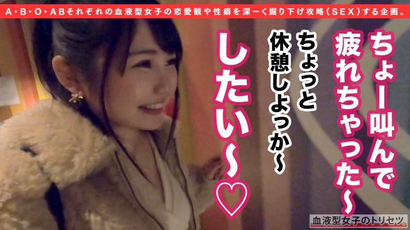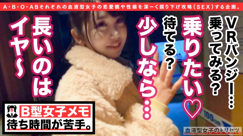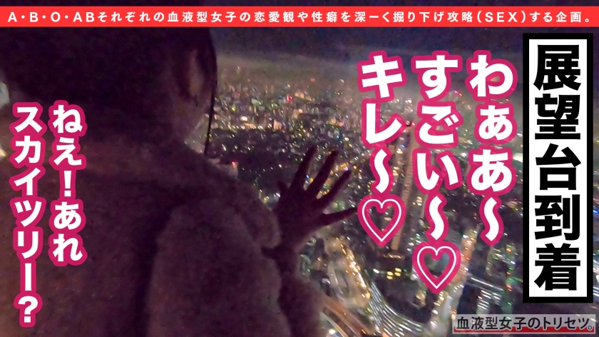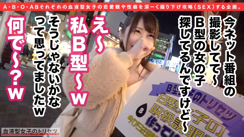 血液型により十人十色の性格を持つ彼女たちの行動、言動、恋愛観や性癖について深ーく掘り下げ、SEXまでを撮影するという完全無欠のナンパ企画である。今回は池袋でシロウトさんに声掛けをしていると、B型のもなちゃんと出会いました。最近人気の星座パフェが目的で北海道から来たようです。流石B型、突発的な行動力が凄まじいですねww企画内容を説明して、デート形式での同行を快諾して下さいました。カフェでは、B型らしい優柔不断な面や、とことん欲望に忠実な面を見ることが出来ました。その後、もなちゃんが夜景を見たいと知り展望台へ場所を移します。展望台では、もなちゃんの可愛いさを存分に堪能できました。相性診断で低い数値が出ても、ポジティブに励ましてくれたり。長時間並ぶのが嫌だと子供のようなことを言ったり。VRバンジーで人目を気にせず叫び倒したり。彼女に欲しい楽しい子ですねwアトラクションに遊び疲れたところで、休憩と称してホテルへ向かいます。そこでB型女子の性生活を取材すると、セックスをする時は自分からフェラをしたいとか、頼み込むと下着を見せてくれたりとか、男性をエッチに誘う実演までしてもらいましたが、最高に可愛かったですwww良い雰囲気になってきたところで、豊満なおっぱいを揉ませていただきますっ!!こんなにやわらかくて、大きくて、綺麗な桃色乳首とか反則おっぱいでしょwお腹も程よく引き締まっていて、筋肉のラインやくびれが美しいです。これは10点満点っ!!前戯を終えるともなちゃん自ら「寝バックが好きぃ...」とのおねだり。ご要望通り寝バックで突きまわすと、よほど気持ちが良いのか身体をくねらせて喘いでくれますww「しゅごい」「ひもひぃい!」と呂律の回らないところがまた可愛い!その後もバックを中心に攻め回し、最終的に胸へ発射。もなちゃんも満足してくれたのか、恍惚とした表情で余韻に浸っていました。やっぱりB型女子は、普段もセックスも好きな事から始めるんですね♪
