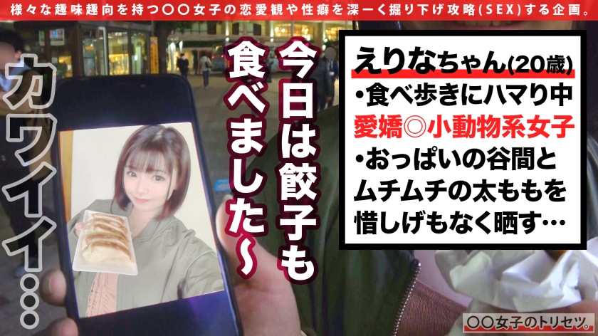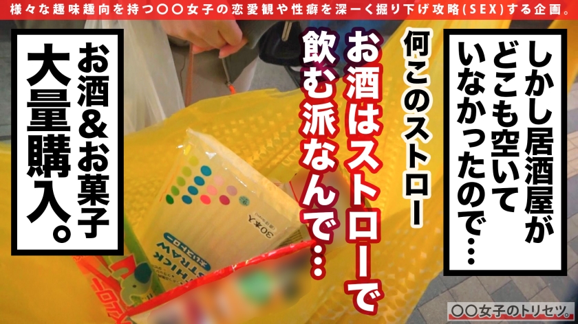 この世に存在する女子は様々な趣味趣向を持ちます。十人十色の性格を持つ彼女たちの行動、言動、恋愛観や性癖について深ーく掘り下げ、SEXまでを撮影するという完全無欠のナンパ企画である。今回は吉祥寺で出会った、O型の食べ歩き女子えりなさんに同行しちゃいます♪すでに人気店のメンチカツにさつま揚げを購入済!食べ歩きしてる最中でしたw仕方がないので居酒屋で取材を行おうとするも、今のご時世どこも閉まっていました...仕方ないですね。ということで!お酒を購入し、ごく自然な流れでホテルへGO!もちろんヤリモクです。ホテルへ着くとすぐ上着を脱ぎだすえりなちゃん。谷間が見えてエロい!大きい!!部屋にロフトがあったので上ると、エッチな身体をくねらせ、えりなちゃんが誘ってきます。食だけじゃなく、男も食べ歩くんですね!?さっそく頂いちゃいましょう♪「おチ●チン硬くなってる」と言いながらペロペロと舐めてくれます。ロフトだけでは終わりません。下に降りてマ●コを攻め返します!手マンだけでもグショグショになっちゃいましたが、電マでさらに追い打ち!ほぐれたところで、今度は大きなおっぱいを味わいます。揉みごたえ抜群!!こちらが攻めているのに、えりなちゃんはお尻を振って挑発してきます!今度は喉奥フェラを堪能。からの69。マ●コを食べチ●コを食べられ極上体験を受けます。準備万端のマ●コへ挿入しセックス開始。貪るように腰を振るえりなちゃんがクソエロいwバックでこちらも負けじと腰を打ち付け、身体をベッドへ押し付けゴリゴリ突きます。次は場所を風呂場へ移してオイルでテカテカセックス!後ろから抱くように突き続け、そのまま廊下へベッドへ移動式交尾!!最後に顔射すると、嬉しそうに微笑むえりなちゃんがエロ可愛かったぁ~~www