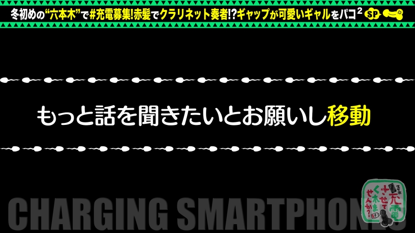 「充電させてくれませんか?」と優しい美女にお願いして、スマホを充電させてもらいつつエッチな充電もしちゃうスケベ企画。今回充電器を貸してくれた女神は、あんちゃん。クラリネットを片手に来てくださいました!!充電器を貸してくださり、100%になるまでの間にオ・モ・テ・ナ・シを行いますっ♪映えスポットに改装した特殊な車でローター責め!チ●コ両刀Wフェラ!ホテルへ到着するとすぐに再開!たわわな巨乳を電マで震わせる!マ●コも震わせながらチ●コを咥えるあんちゃん。パイズリの乳圧にチ●コが負けるwそろそろチ●コが待ちきれないようなので挿入れちゃいましょう!電マをマ●コに押し付けクリを刺激しながら腰を打ち付けますッ!下から突くたびにデカ乳が跳ねるwマ●コの膣内も気持ちいいし、眺める光景も絶景のエロス!!当然中出しキメちゃいました!!衣装チェンジで二回戦突入です!バックで奥までズッポリハメちゃいます♪正常位でも腰を打ち付け、最後はおっぱいに大量射精!!無事充電も100%になり、あんちゃんも充電完了出来たみたいですwww