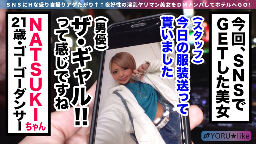 SNSにHな写真を上げているヤリマン女子にDMして、流れでそのままホテルでSEXまでしちゃう企画です。今回の映え女子はNATSUKIさん!待ち合わせ場所でナンパされてる!ガチでイケイケギャルの登場ですwダンサーさんということで、引き締まったエロい身体ですね!ホテルへ到着し、お酒を飲みながらボディタッチ!Fカップの巨乳を揉むと、マ●コがもうヌレヌレwしかもパイパン!ヤリがいありますね!こんなに準備万端ならもういいですよね?ということで、挿入!ソファで激しくピストン!小柄なので上に乗せても軽々と腰を振れちゃいます!「ピル飲んでる」とOKを頂いたので中出しwww汗と精液をシャワーで流した後は、もちろんヤリ足りないので2回戦へ突入!ダンサー衣装に着替えてもらい、チ●コも追加投入!バックで突きながらフェラしてもらう2本同時プレイ!寝バック中に「酒が足りない!」と飲みだす泥酔ギャルを、チ●コ2本で責めまくります!中だけでなく、胸、お腹、口の中にも大量射精!精液まみれのギャルダンサー完成!!NATSUKIさん、チ●コ2本でやっと満足してくれましたw性欲強すぎ!www