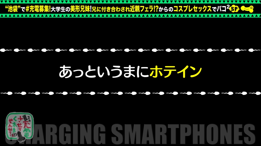 「充電させてくれませんか?」と優しい美女にお願いして、スマホを充電させてもらいつつエッチな充電もしちゃうスケベ企画。今回充電器を貸してくれた女神は、ななみちゃん!お兄ちゃんと一緒に充電器を貸してくれましたっ!優しいですね♪お礼にやりたいことを叶えます!とお伝えすると、お兄ちゃんがコスプレ好きとの事で衣装を買いに行くことに!コスプレ鑑賞が好きらしいので、ななみちゃんに似合うコスを買っちゃいました!そしてホテルへ到着、衣装を着替えに行ってもらうと…兄妹でいちゃいちゃし始めちゃいましたwww妹の身体に興奮する兄。クンニしたと思えば、ななみちゃんにフェラさせて口内射精!禁断のワンシーンを目撃しちゃいましたwその後何事もなく戻るななみちゃん。お兄ちゃんは「用事があるので!」と急いで帰ってしまいました。エッチな衣装を着てポーズを取るななみちゃんにムラムラが止まりません!せっかくのホテルですし、ヤッちゃいますか?w小ぶりな美乳を吸い、手マンを始めるとすぐに潮を吹いちゃう敏感娘でした!オモチャでも責め、沢山イカせたあと挿入!もちろん中出しキメちゃいます!精液を流しにお風呂へ行きますが、ここでもセックス!w風呂から上がると、学校の服に着替えてもらいセックス再開!何度も絶頂し、顔を歪めるななみちゃんが可愛い!最後はお口に射精し、お掃除フェラまでしてもらっちゃいました♪